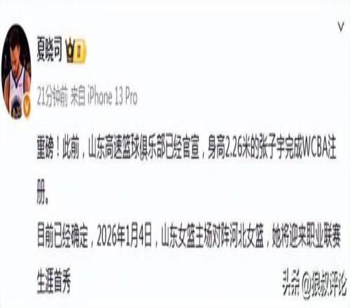 北京时间12月29日,根据山东媒体人“夏晓司”报道,山东高速篮球俱乐部已经官宣,身高2.26米的张子宇完成WCBA注册。