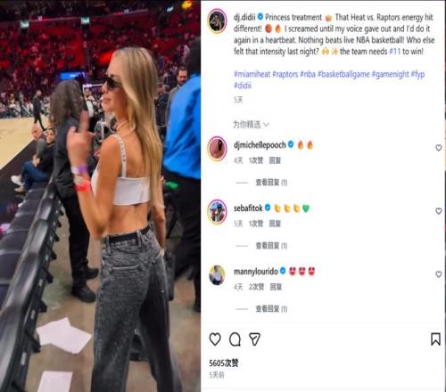 在社交媒体上,她写道:“公主级待遇 !那场热火对阵猛龙的比赛氛围太燃了! 我一直尖叫到嗓子都哑了,但让我再经历一次我也愿意。没有什么能比得上现场观看 NBA 篮球赛!昨晚还有谁感受到了那种紧张刺激的气氛?这支球队需要 11 号赢球!”