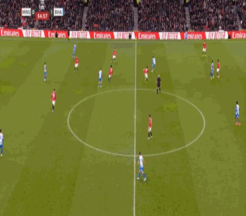 这次进攻没打成,被布莱顿倒到另一侧之后,曼联中场极度空虚,乌加特缩进后卫线,而约罗更没有弹出来的想法,所以当你觉得库尼亚是不是在和谢什科打双前锋的时候,他又在这次防守里回到了左边路: